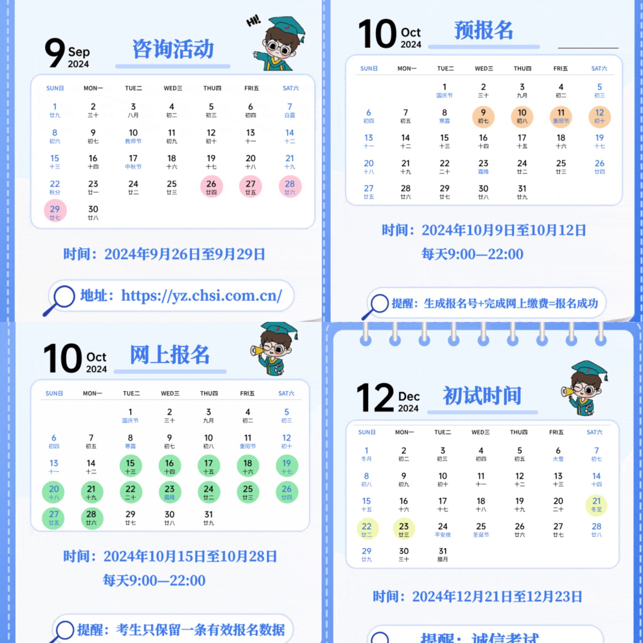 网上报名时间为2024年10月15日至10月28日(网上预报名时间为2024年10月9日至10月12日,相关工作安排由各省级教育招生考试机构确定并公布),每日9:00~22:00。请考生届时登录“中国研究生招生信息网”(网址:https://yz.chsi.com.cn)参加报名,查看报名须知、招生单位招生章程及省级教育招生考试机构有关报名、考试安排事项等,按要求如实填写信息并提供真实材料。